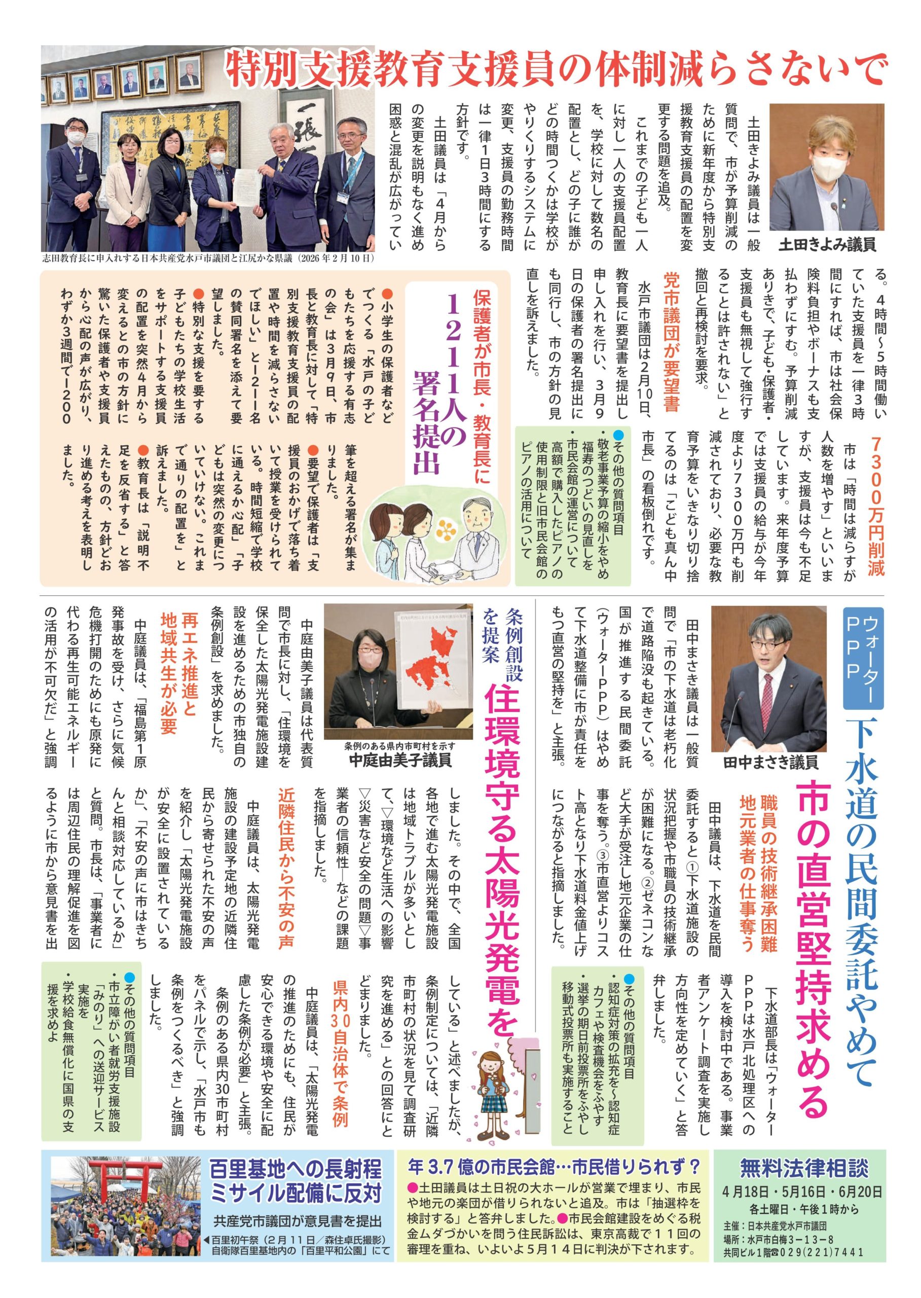 2026年3月定例水戸市議会が開かれ、日本共産党水戸市議団は、中庭由美子議員が代表質問、田中まさき議員、土田きよみ議員が一般質問、各常任委員会で審議を行いました。