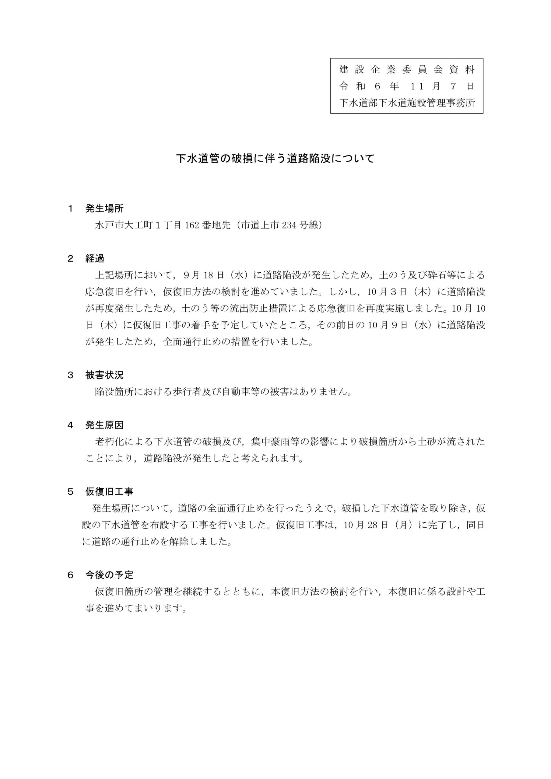 水戸市でも昨年9月から10月にかけて、大工町1丁目で道路陥没が発生し、全面通行止めとなりました。11月7日の建設企業委員会では、下水道管の老朽化による破損と、集中豪雨で土砂が流されたことが原因との報告がありました。